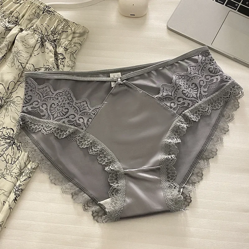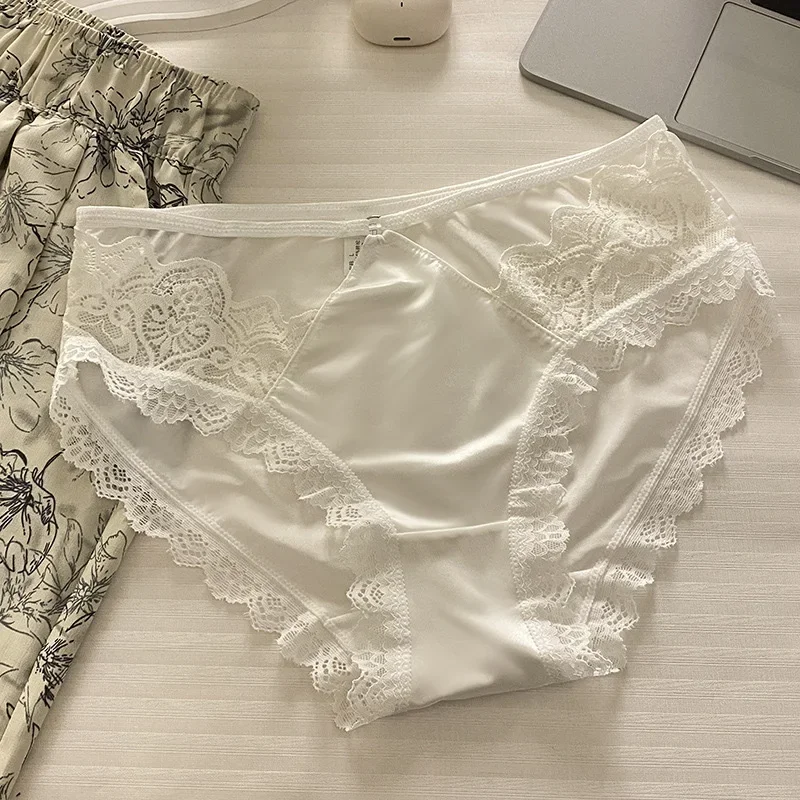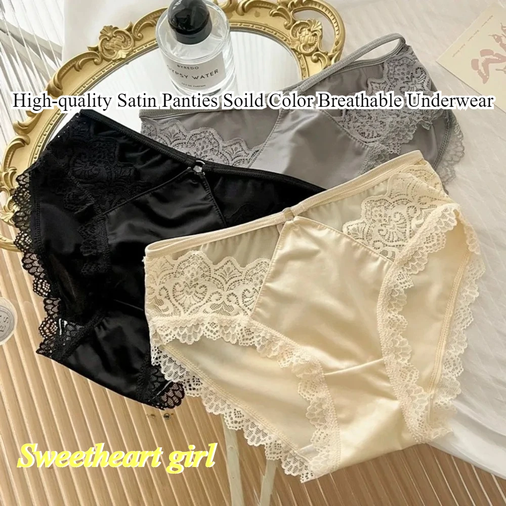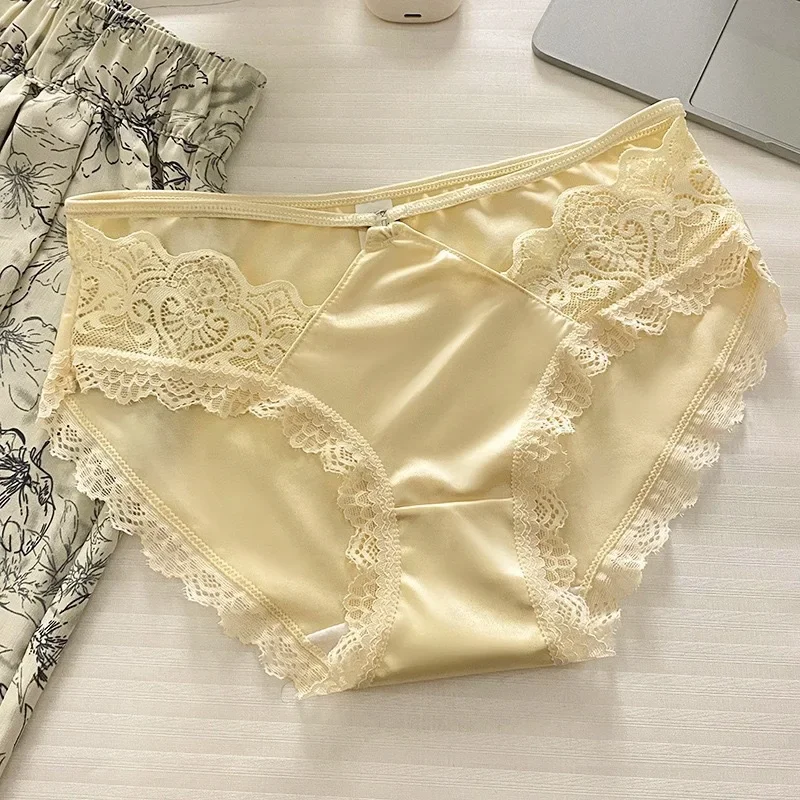 High-quality Satin Panties Soild Color Breathable Underwear Women French Sexy Lace Bow Lingerie Mid-waist Thin Mesh Briefs 도매