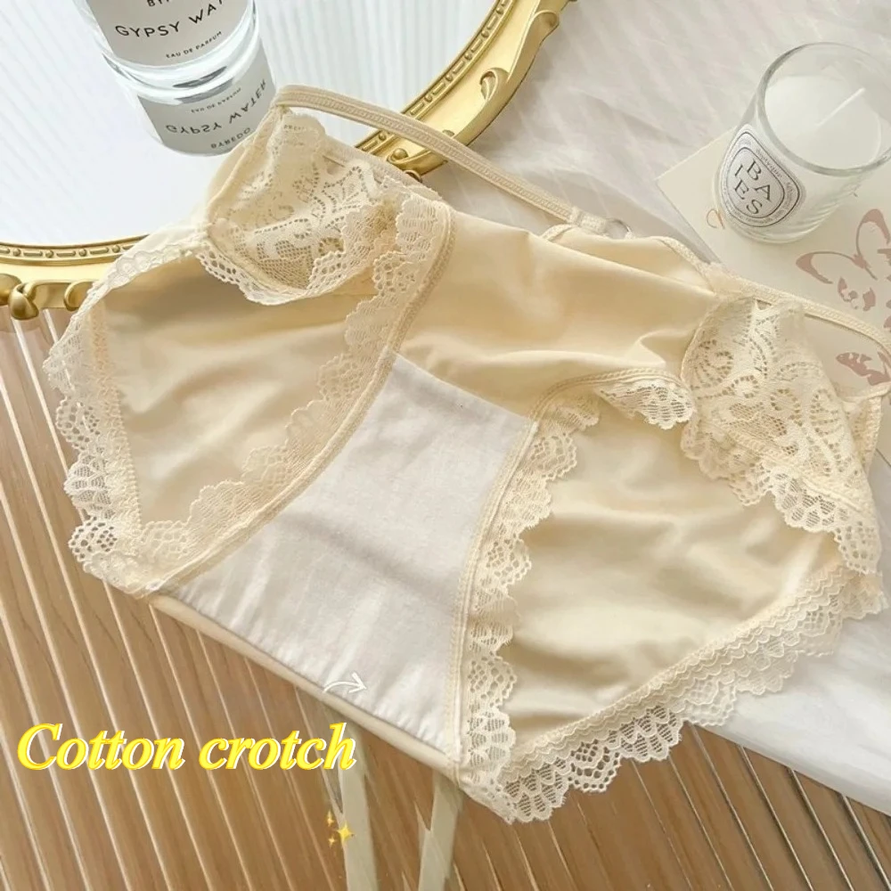 Vintage Satin Panties Soild Color Breathable Underwear Women French Sexy Lace Bow Lingerie Female Mid-waist Thin Mesh Briefs