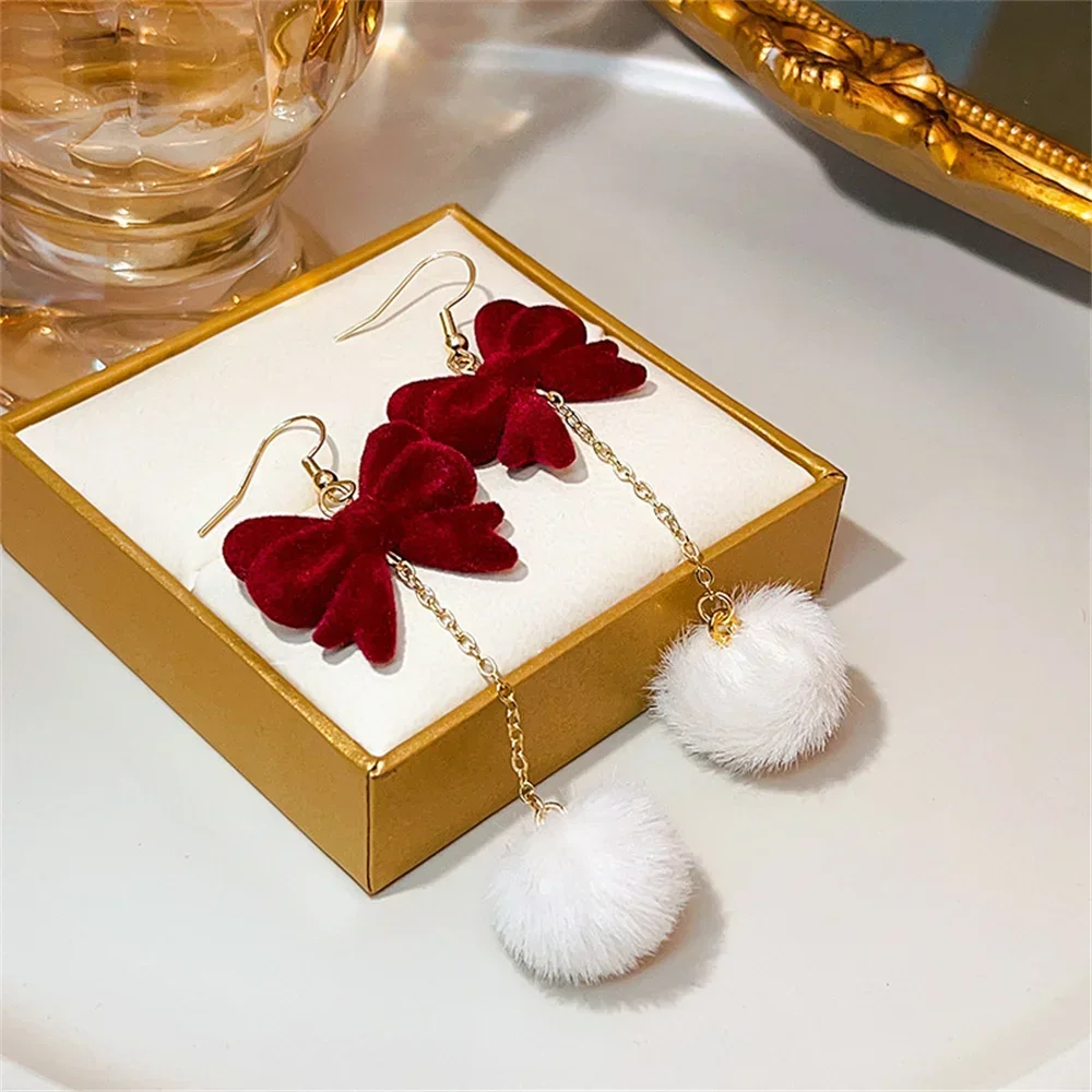 Vintage Red New Christmas Flocking Earrings For Women Bow-knot C-Shape Pearl Rhinestone Drop Earring Jewelry Party Gift 2024