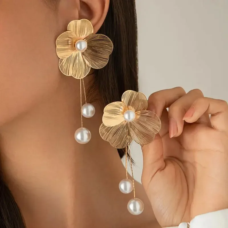 Romantic Flower Petal Long Tassel Drop Earrings for Women 2024 Trend Imitation Pearl Hanging Piercing Earrings Wed Jewelry Gift